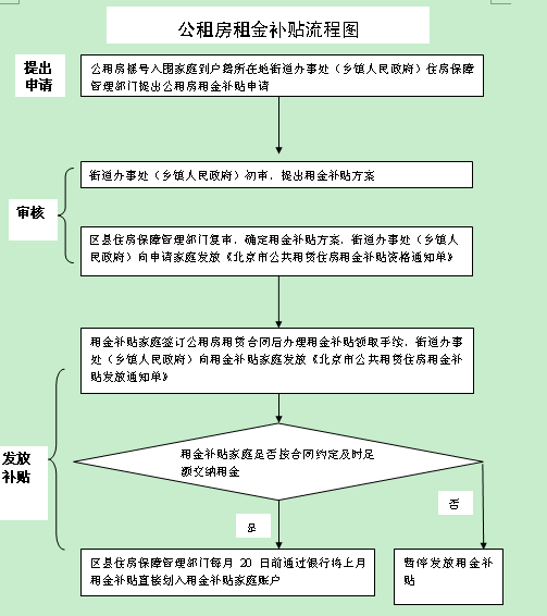 注:截至发文之日,本市城市低保标准为家庭人均月收入520元,城六区廉租住房家庭收入准入标准为人均月收入960元及以下。 本市其他区县超出廉租住房保障条件的城镇户籍家庭公租房租金补贴占房屋租金的比例、租金补贴建筑面积上限应与城六区一致,家庭人均月收入分档线由区县政府确定。 本市公租房租金实行市场定价、分档补贴、租补分离。目前,全市公租房租金价格基本在项目周边房屋市场租金价格的80%至90%之间,且三年不变。加上补贴后,中低收入家庭实际负担租金水平相当于市场租金价格的4%至81%。 租金补贴程序 申请、审核:符合租金补贴申请条件的公租房摇号入围家庭,可以申请公租房租金补贴,公租房租金补贴家庭资格审核工作与公租房公开摇号前复核工作一并进行。其中,取得廉租住房实物配租或廉租住房租金补贴资格的家庭,住房保障部门可直接确定其公租房租金补贴方案。其他家庭公租房租金补贴申请、审核实行街乡、区县两级审核制度。申请家庭须出具相关证明材料,街乡、区县住房保障部门在对其提供的材料审核的基础上确定租金补贴方案。 发放管理:申请家庭取得公租房租金补贴资格并签订公租房租赁合同后,方可办理租金补贴领取手续,住房保障管理部门确定其租金补贴金额、代发银行及账号。按照“租补分离”原则,承租家庭交纳租金后,住房保障管理部门再依照规定按月向承租家庭发放租金补贴。租金补贴的发放主要通过住房保障信息管理系统及银行系统实现。公租房产权人每月5日前在系统中确认承租家庭上月租金交纳情况,区县住房保障管理部门通过系统确认租金补贴应发明细,并于每月20日前通过银行将上月租金补贴直接划入取得公租房租金补贴资格的承租家庭账户。承租家庭未能及时交纳租金的,住房保障管理部门暂不发放公共租赁住房租金补贴,待其补齐相应租金后一并补发。 调整及退出管理:对廉租家庭按现行廉租政策规定进行资格变更、取消及年度复核。其他家庭情况发生变化后可随时申请变更补贴金额;租金补贴家庭每年4月必须申报家庭变化情况,区县、街道(乡镇)对情况变化的家庭逐一复核;对未变化的家庭采取抽查和普查相结合的方式复核。根据资格复核情况,调整或取消租金补贴。 监督管理:对于不如实申报家庭人口、收入、住房、资产等情况以及伪造相关证明骗取租金补贴的申请家庭,由区县住房保障管理部门取消租金补贴资格,已骗取租金补贴的,由区县住房保障管理部门责令退还,并通过媒体公示并计入信用档案,五年内不得再次申请保障性住房。构成犯罪的,移交司法机关追究刑事责任。国家机关、事业单位、国有企业等工作人员提供虚假证明骗取租金补贴的,移交相关纪检监察机关处理。 市住房保障管理部门对区县公共租赁住房租金补贴工作进行指导、监督、定期检查。发现违反相关规定或不按程序操作的,责令其限期整改,并对整改情况进行检查。对造成恶劣影响的工作人员,提请纪检监察机关进行查处。 |