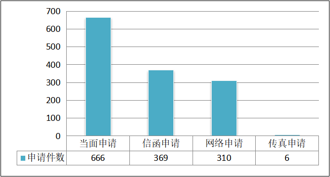 2017年共收到政府信息公开申请1351件,与2016年度相比,增加了286件。从申请方式看,当面申请666件,占49.3%;以信函形式申请369件,占27.31%;通过网络申请310件,占22.95%;以传真形式申请6件,占0.44%。
