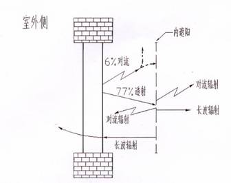 图1为内遮阳设施对太阳辐射的影响,进入窗户的太阳辐射热由内遮阳设施被二次分配,一部分直接透过遮阳设施进入室内,另一部分被遮阳设施反射,还有一部分被遮阳设施吸收,再由长波辐射和对流方式向室内和室外散发,显然,由于内遮阳设施的存在,进入室内的太阳辐射热在传输过程中受到了阻挡,减少了最终进入室内的热量,从而降低了室内的太阳辐射得热量。内遮阳设施还可以使室内光线柔和,采光系数均匀,缓解强烈的眩光。