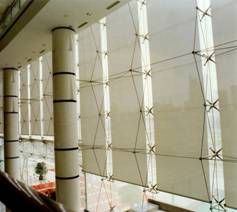 罗马升降轨机构是制作波浪帘、罗马帘、扇形帘、折叠帘等艺术帘所使用的一种窗帘机构。该机构利用轻型轨作为基础,在铝轨一端设有一套拉珠式传动箱,内含弹簧超越离合器,从而有效地实现单向传动控制。铝轨中间设置多只鼓轮卷绳器,通过一根四角传动棒联成同步传动方式,四角传动棒的一端直接与传动箱连接。使用罗马升降轨最大宽度2.5m;最大高度3.5m;机构最大承受重量7Kg。必要时可采用一拖二形式,尺寸小时可一拖多。当升降轨用于转角处,此时可用万向接头连接升降轨。波浪帘、罗马帘、扇形帘、折叠帘可以变换出多种形态,运用于宾馆、饭店等活泼场合,构筑艺术氛围。罗马帘应用实例见图13。