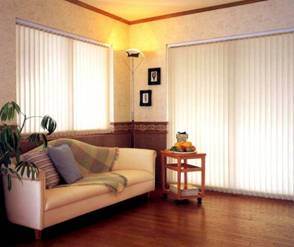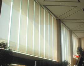 垂直切割光线的帘称垂直帘。垂直帘适宜于东西向遮光,也可作为隔断,把室内划分为不同区域。垂直帘经受不起风吹。风一吹能将整齐的帘片吹散搅和在一起,不美观也遮光不良。更适宜于在有空调的室中使用。垂直帘应用实例见图12。