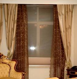 布帘是内遮阳应用最广泛的产品,对应于百叶帘、垂直帘又有平帘之称。布帘由面料和导轨系统两部分组成,导轨系统主要有轻型,重型和电动轨三类。面料是纱类轻薄织物通常选用轻型轨;厚重类面积较大的布帘采用重型轨和电动轨。普通家装通常采用轻型轨,部分采用重型轨。经济条件允许也可使用电动产品。