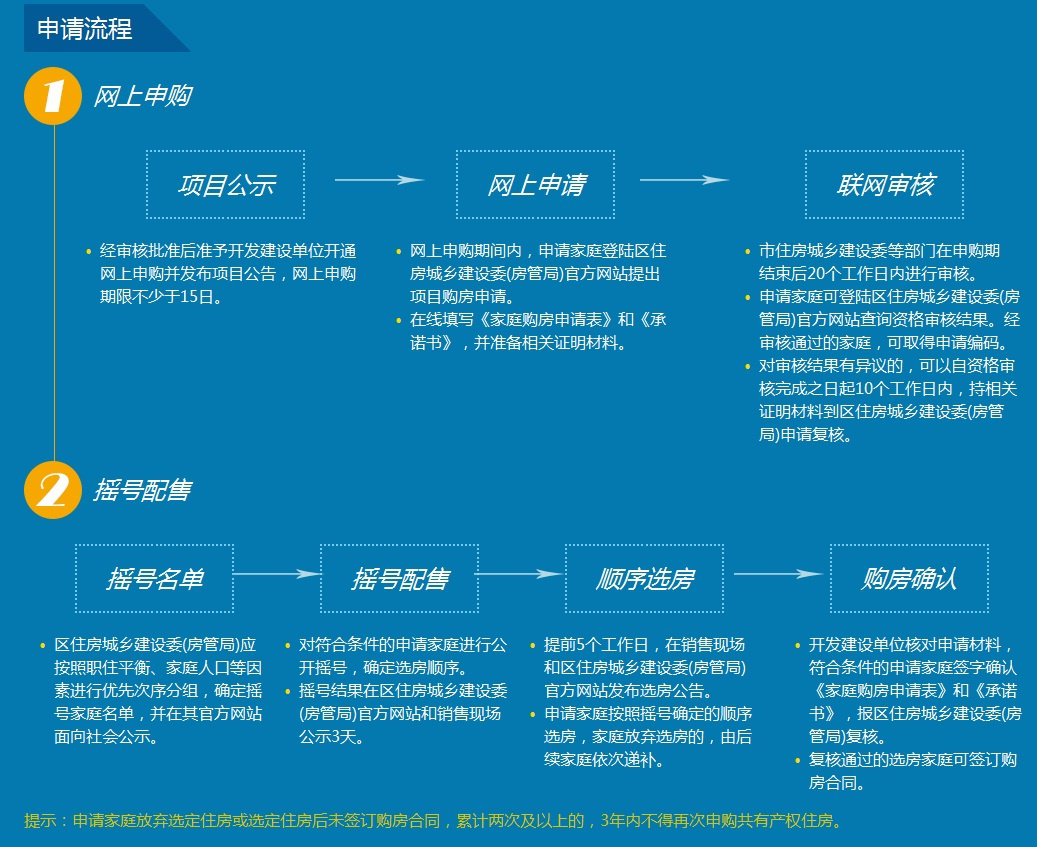 (1)网上公告。开发建设单位取得项目规划方案复函后,向项目所在区住房城乡建设委(房管局)提交开通网上申购的申请,经审核批准后准予开通网上申购并发布项目公告,网上申购期限不少于15日。