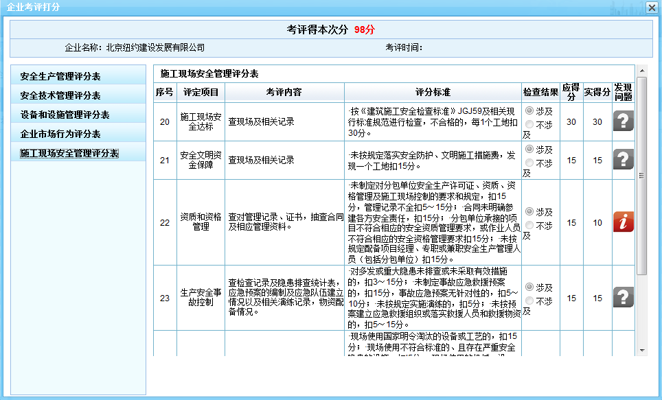 完成检查后,登陆平台,在打分界面依次录入各项内容检查结果。如果有扣分项,需要在在发现问题栏,点击“?”,输入问题的文字描述;最后点击“提交考评结果”,将考评结果提交至第三方机构。