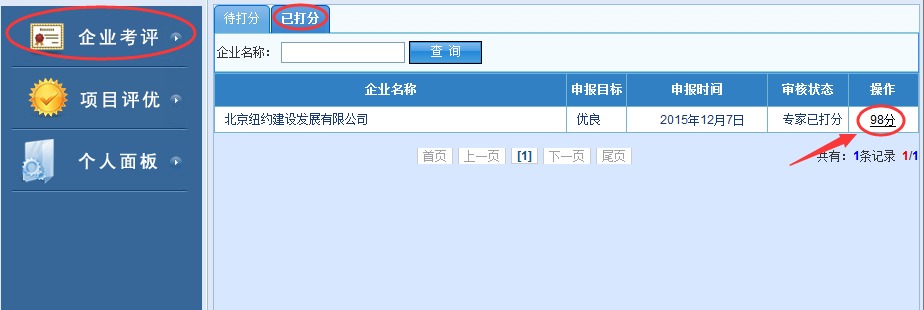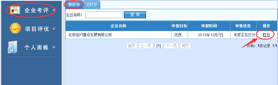 1)申报目标为“优良”的企业,第三方机构完成企业材料审核后,由企业考评专家开展企业考评初评。点击“待打分”列表中的“打分”,开始评分