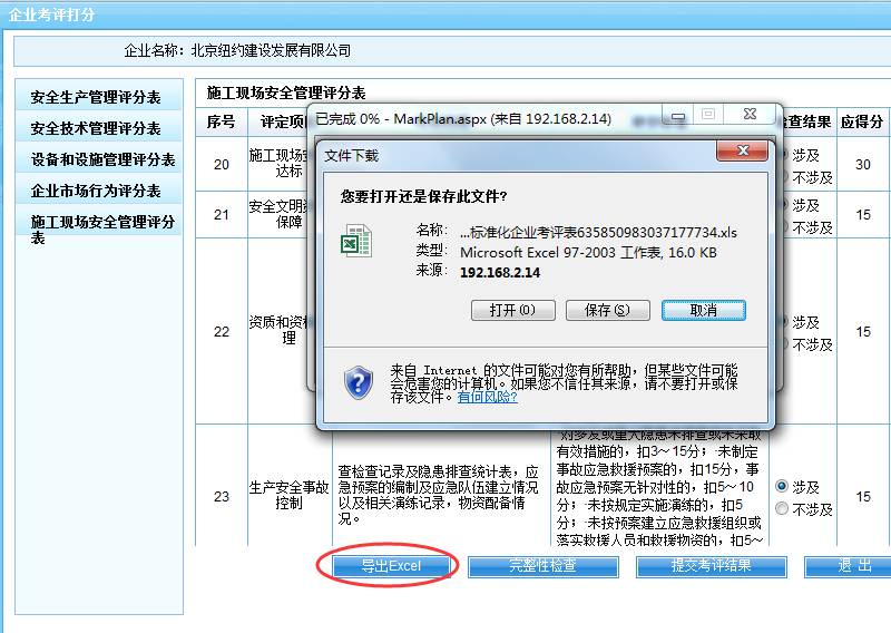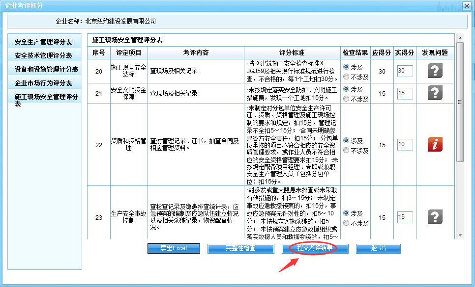 先导出excel文档,打印文档后去现场检查。选择检查项目是否涉及,不涉及不打分;涉及项按评分标准打分,扣分项记录问题详情。