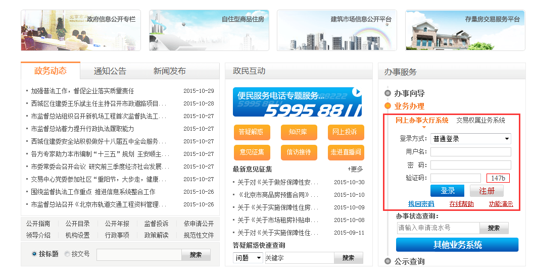 一、 登陆平台1)首先在计算机桌面双击游览器图标,打开浏览器,在浏览器地址栏输入北京建委网地址,界面右侧为网上办事大厅系统登录窗口。