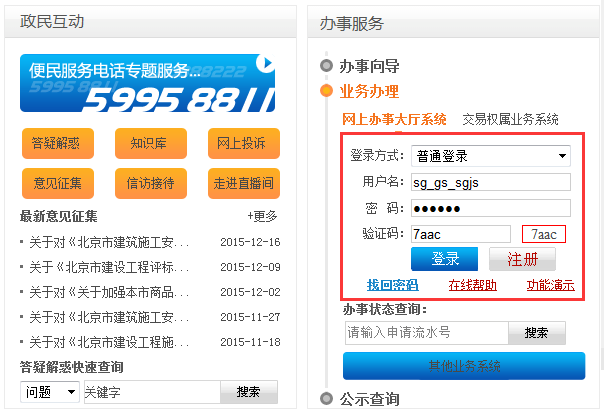 2)在网上办事大厅系统登录窗口。输入用户名、密码、验证码,点击“登陆”