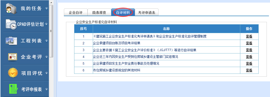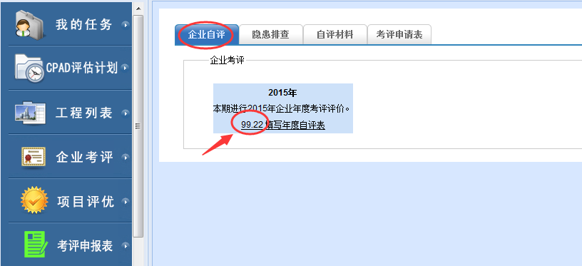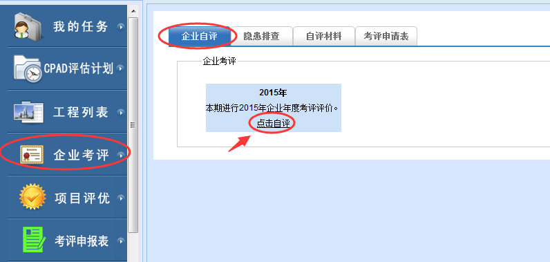 2.5自评材料1)在“企业考评”界面中,点击“自评材料”