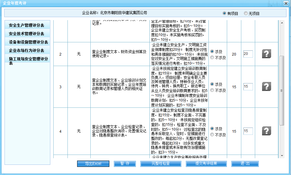 2)在“企业年度考评”界面,可以导出excel文档进行检查,将结果录入平台,确认无误后,点击“提交考评结果”