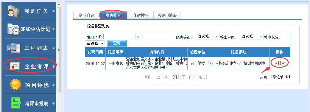 2.3隐患排查1)在“企业考评”界面中,点击“隐患排查”/“未排查” 2)录入隐患整改情况