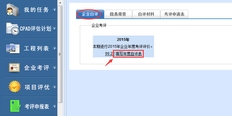 2.4填写年度自评表1)企业自评相关隐患排查完毕后,在“企业考评”界面中,点击“年度自评表”