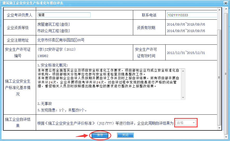 2)填写企业考评负责人信息、安全标准化概况、年度自评结果,点击“保存”。企业本周期内自评结果由系统自动判定。 注:如果有隐患未整改,无法保存自评表,需要完成隐患整改后再提交。