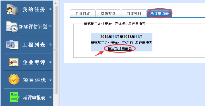 2.6考评申请表1)在“企业考评”界面中,点击“考评申请表”,“填写考评申请表”
