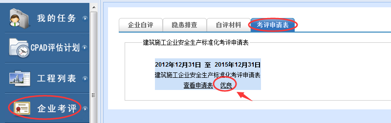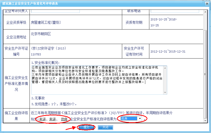 2)填写考评申请表。填写安全标注化概况,选择自评结果(优良、合格、不合格、整改后合格、无项目),点击“提交” 备注:在安全生产许可证到期前3月内,可填写考评申请表。