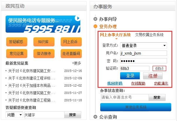 2)在网上办事大厅系统登录窗口。输入用户名、密码、验证码,点击“登陆”