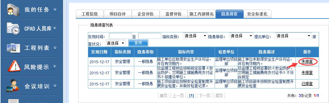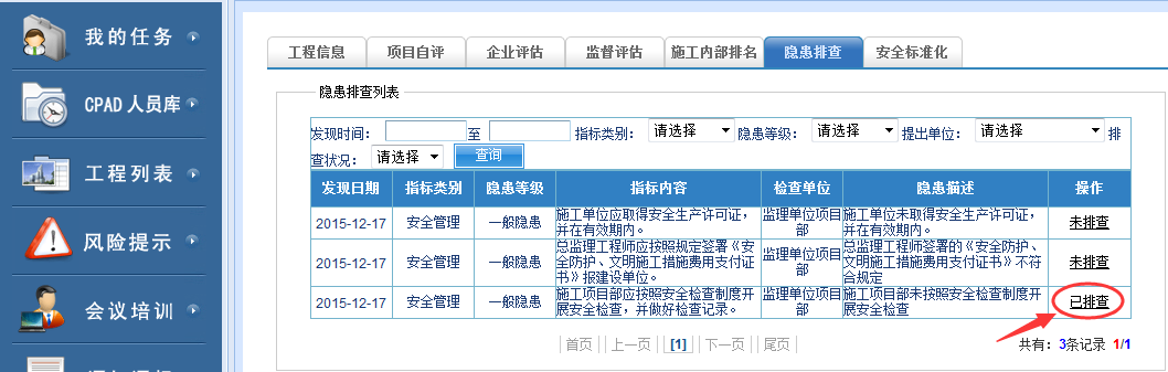 4)输入监理单位意见,点击“保存”。保存后审核意见不可修改 三、 查看隐患排查记录3.1查看隐患排查记录1)在工程列表中,点击对应的工程名称,在“隐患排查”界面中(或在“企业评估”界面中,点击对应季报中隐患数字,可以跳转到“隐患排查”界面),选择时间范围、提出单体等筛选信息,点击“未排查”或“已排查”,查看隐患信息。