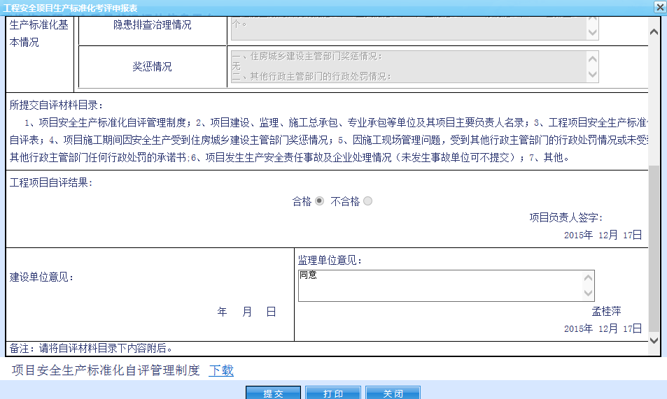 四、 完工材料确认4.1签署监理单位意见施工项目提交完工材料后,监理项目部需签署意见 1)在第1项内容“《工程项目安全生产标准化考评申报表》及项目安全生产标准化自评管理制度”后,点击“查看”