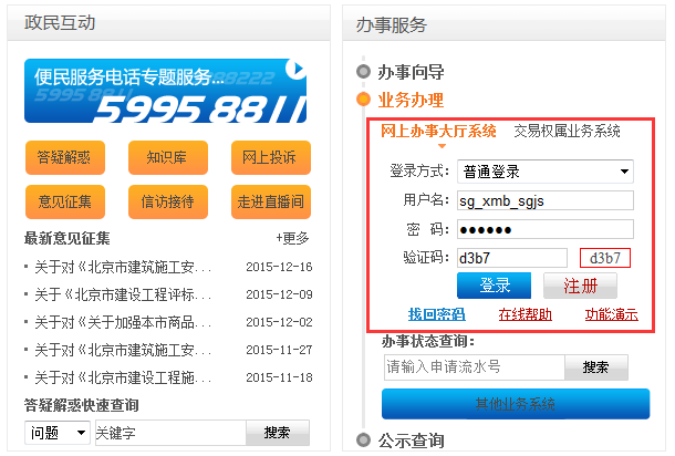 2)在网上办事大厅系统登录窗口。输入用户名、密码、验证码,点击“登陆”