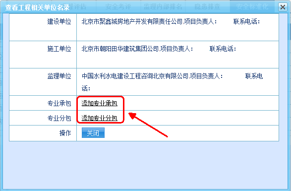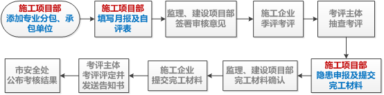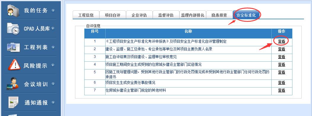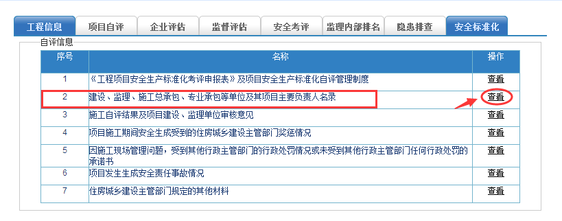 注:施工项目部的登录账号由施工企业新建工程后分配,故施工项目部的账号由施工企业分配。 二、 添加专业承包和专业分包单位2.1项目自评流程图施工总承包单位成立自评管理机构,包括专业承包或分包单位。需先由施工总承包添加该工程项目的专业分包或专业承包单位信息,之后相关的专业承包或专业分包单位可登陆平台,在工程列表中,可查看对应的工程项目信息,并在隐患排查界面中可录入由其负责整改的隐患排查措施。 1)在工程列表中,点击对应的工程名称,在“安全标准化”界面中,点击第二栏中的“查看”。