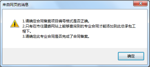 如果合同备案项目编号格式不正确、未完成备案或在建委网站查询不到的专业合同,会出现以下提示。可按照提示进行排查