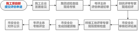 三、 评优申请施工项目部在办理施工监督许可证的时候根据自身情况申请绿色安全工地、绿色安全样板工地的工程项目,并填写安全标准化评优申请,走评优申请流程。(不申请评优的项目不走此流程)。 3.1项目评优申请流程图