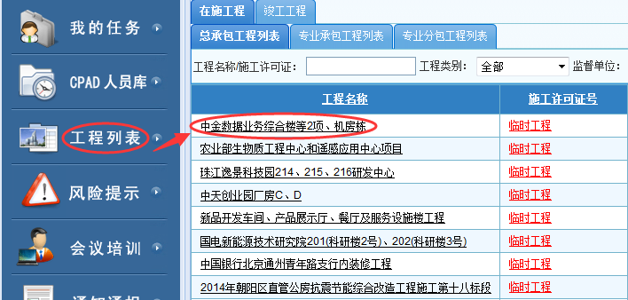 3.2填写评优申请表1)在“工程列表”/“总承包工程”中,点击需要申请评优工程的工程名称。
