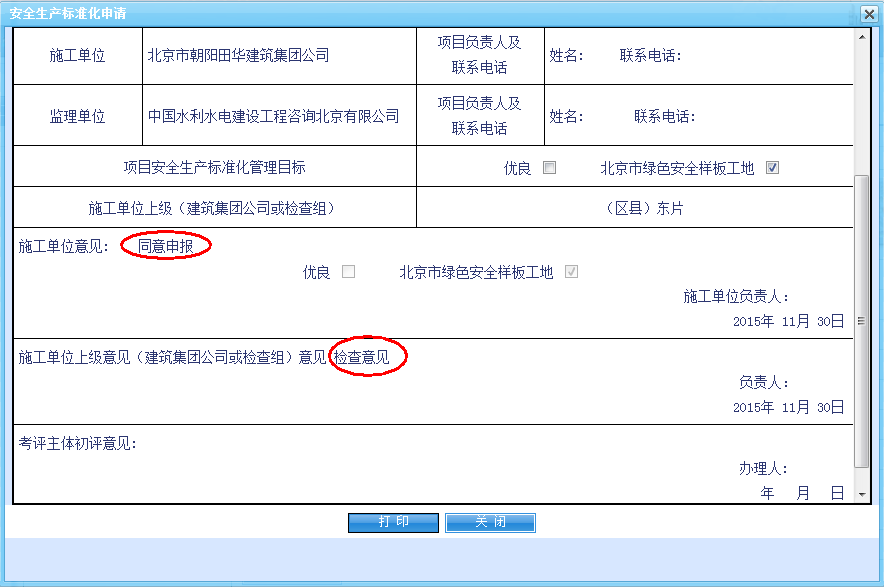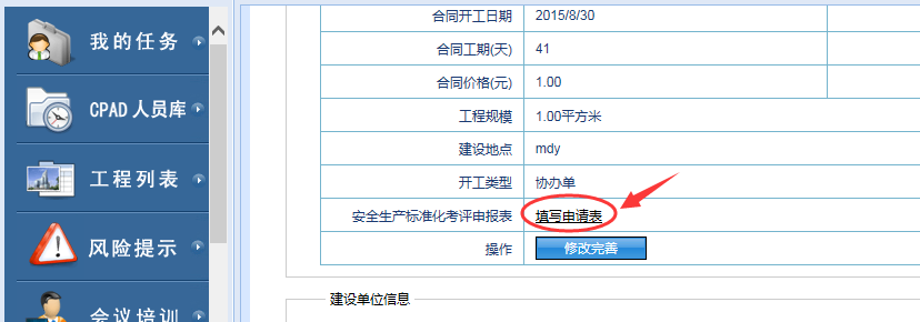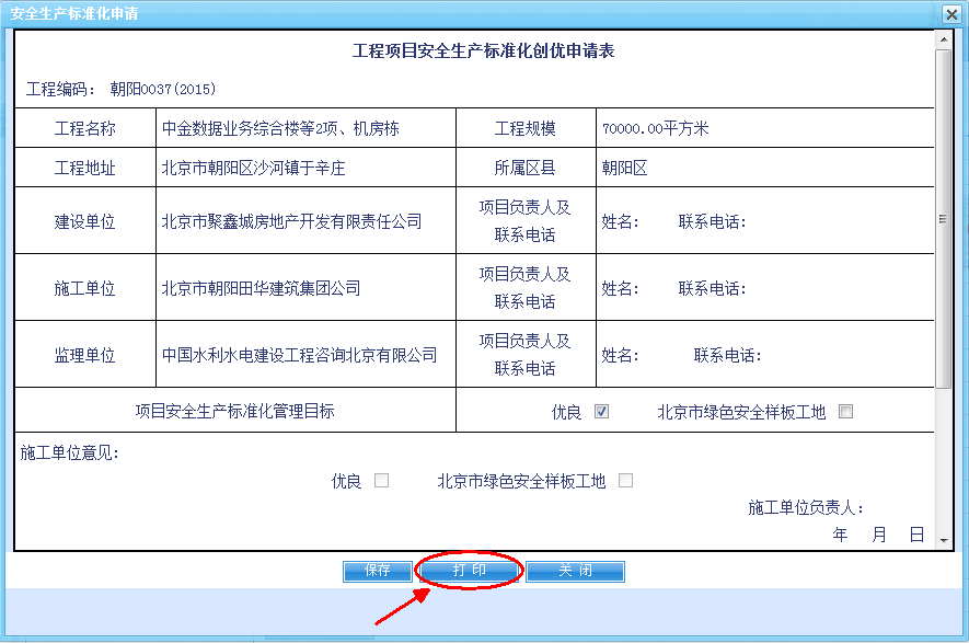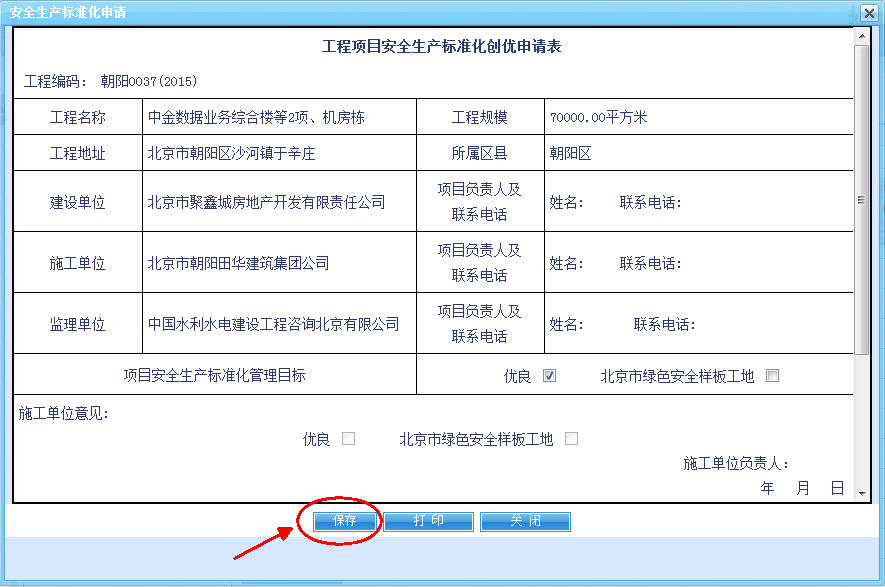 2)在“工程信息”界面中,点击“填写申请表” 3)勾选项目安全生产标准化管理目标,目标为“优良”和“北京市绿色安全样板工地”,其中“优良”为申请评为“北京市绿色安全工地”。之后点击“上报”按钮,由施工单位填写申报意见。