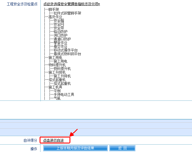 四、 填写并上报自评月报施工项目部,需要每月填写安全标准化自评月报。每月1日至25日24:00为填报截止日期。 4.1填写项目月报施工基本信息填写安全涉及检查点、是否涉及危大分项后,点击项目部自评区域内的“点击此处进行自评”,进入安全标准化检查信息界面。