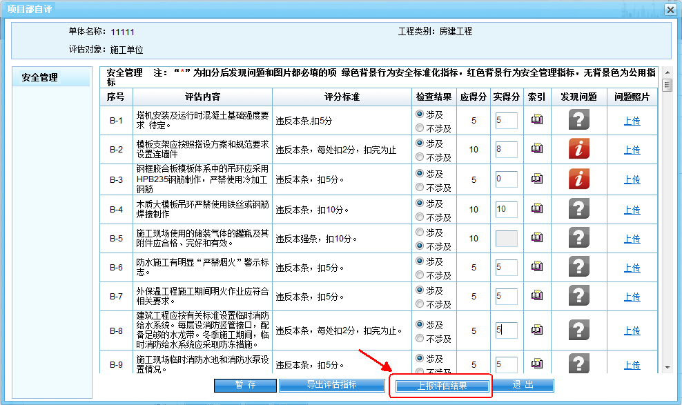 4.2查看并导出检查内容在“项目部自评”界面,点击“安全管理”,可查看安全标准化检查指标。点击“导出评估指标”,系统将生成指标的电子文档。 备注:不同类型指标可通过背景色区分,其中绿色背景为安全标准化指标,红色背景为安全管理指标,无背景色为公用指标。