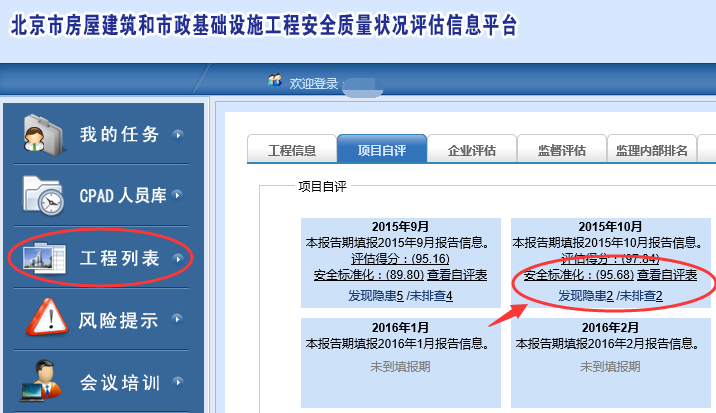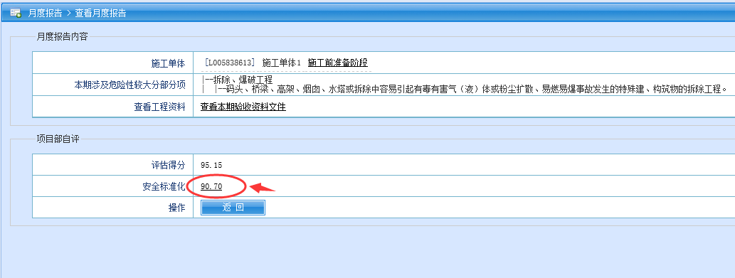 2)月报提交后,在工程列表中,点击对应的工程名称,在“项目自评”界面中,可查看安全标准化月报得分、安全标准化自评表、发现隐患数量及未排查隐患数量。