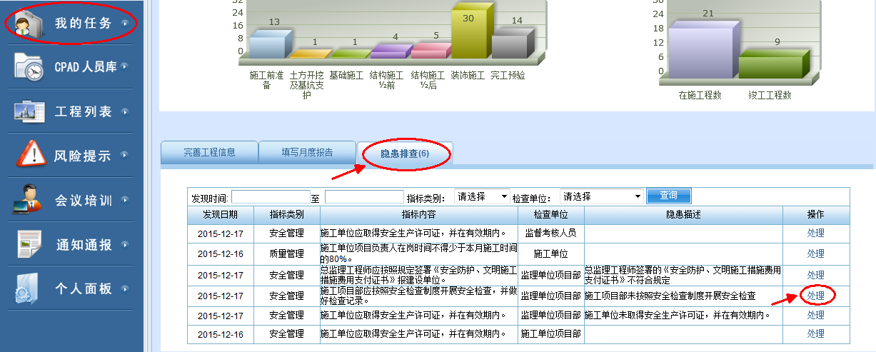 六、 录入隐患排查记录6.1填写隐患排查记录1)在“我的任务”/“隐患排查”列表中,点击“处理”,可填写本单位负责隐患的排查记录; 注:此处隐患列表为各方提出隐患的汇总