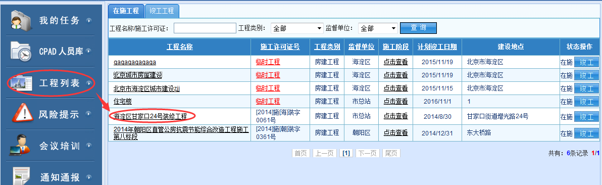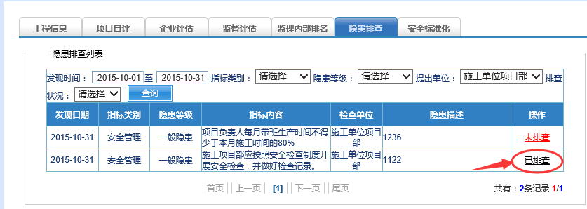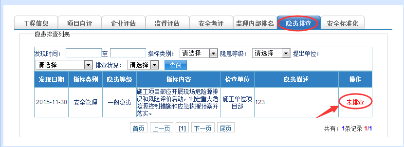在工程列表中,点击对应的工程名称,在“隐患排查”界面中点击“未排查”,也可录入隐患排查记录
