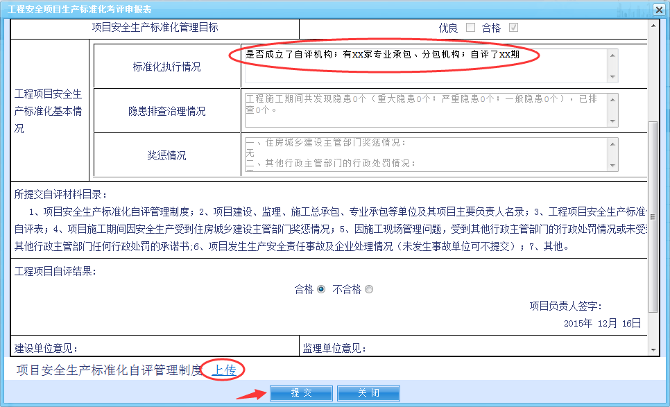 3)填写相关的内容,上传《项目安全生产标准化自评管理制度》并提交。 备注:项目如果申请评优,自评结果为优良、合格、不合格三类,未申请评优的项目自评结果为合格、不合格。
