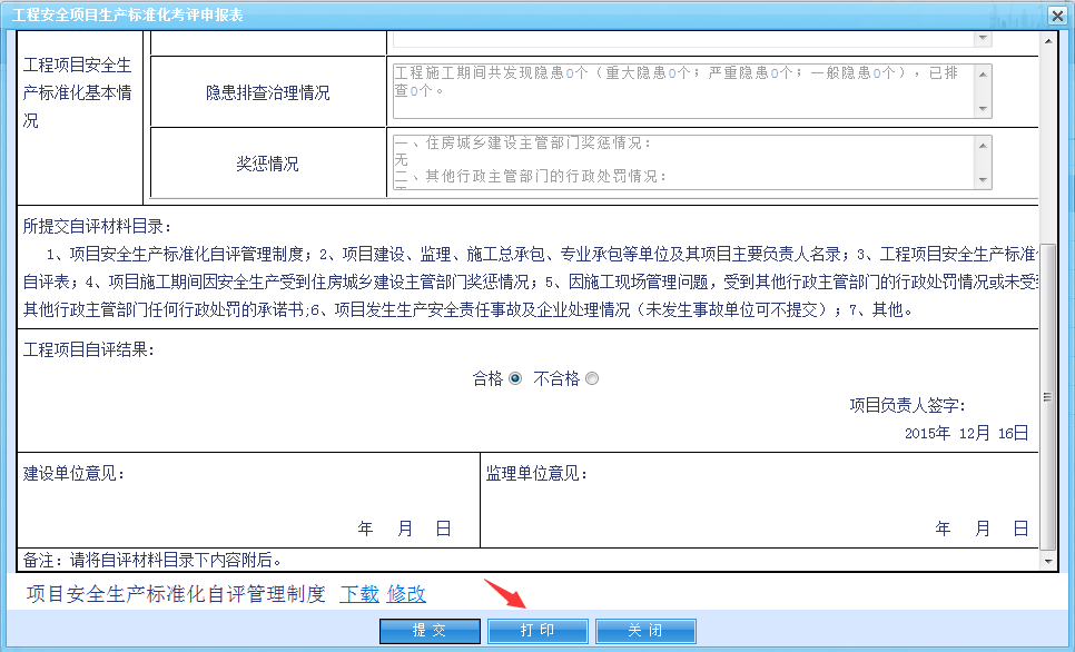 5.2查看自评信息完成自评表上报后,可查看自评表,并进行打印,相关人员签字、盖章存档。项目完工后汇总,提交至区县监督机构。