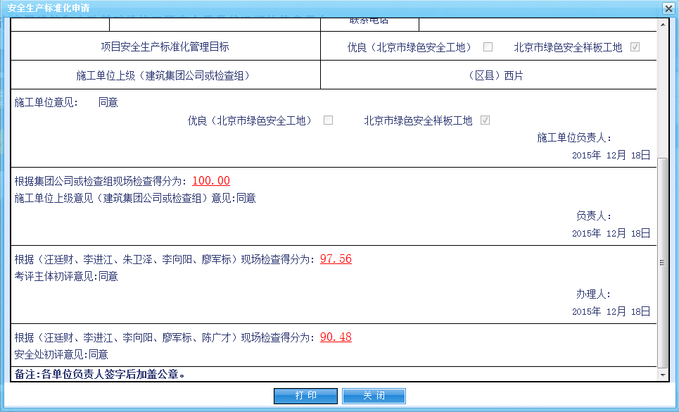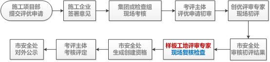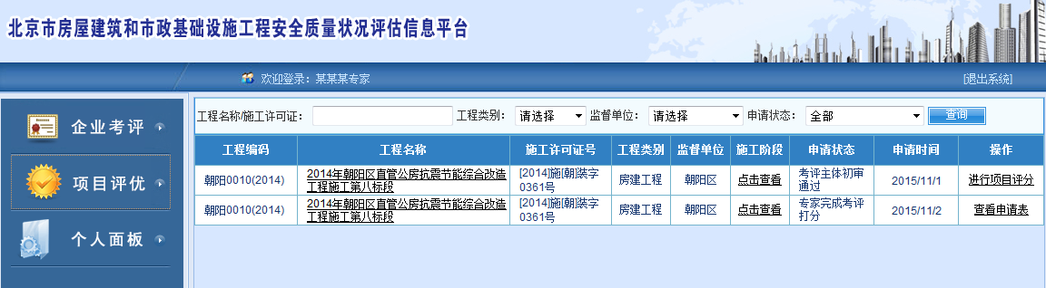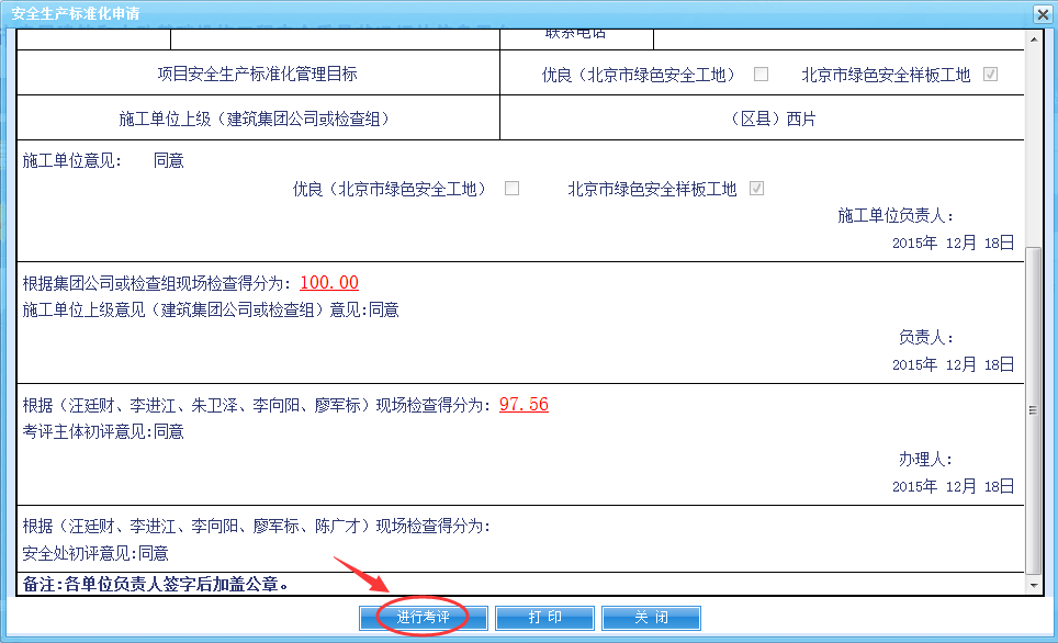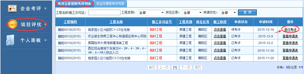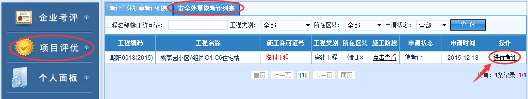1)市安全处审核初评结果后,由样板工地评审专家进行复核检查打分。在“项目评优”/“安全处复核考评列表”中,点击“进行考评”