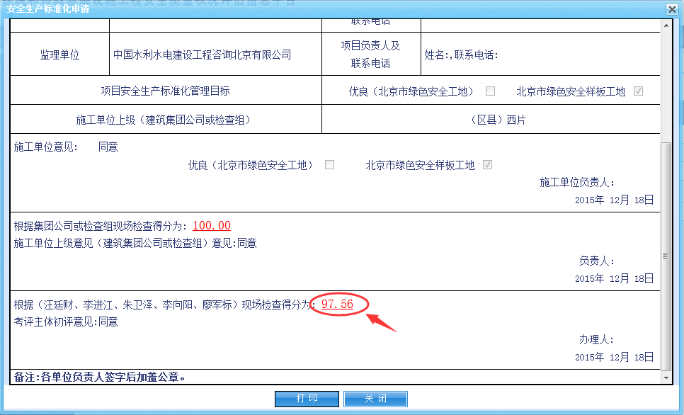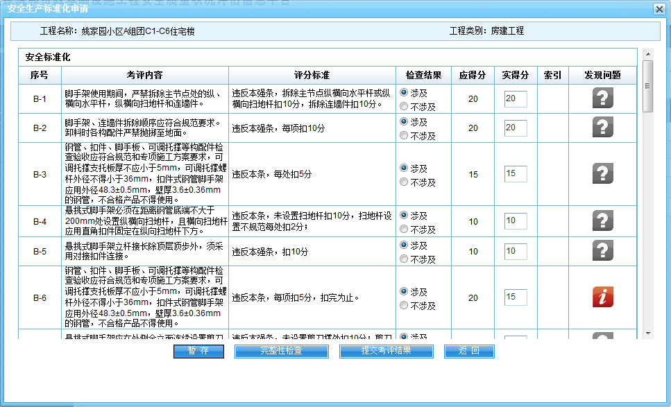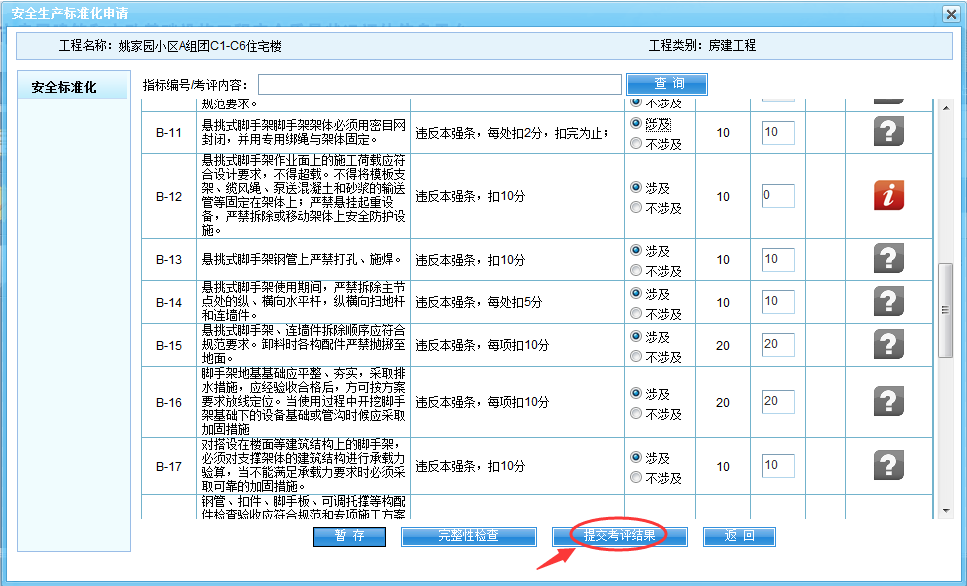 3)选择检查项目是否涉及,不涉及不打分;依据评分标准录入实际得分,如果有扣分项,需要在在发现问题栏,点击“?”,输入问题的文字描述;最后点击“提交考评结果”,将考评结果提交至市安全处进行初审。